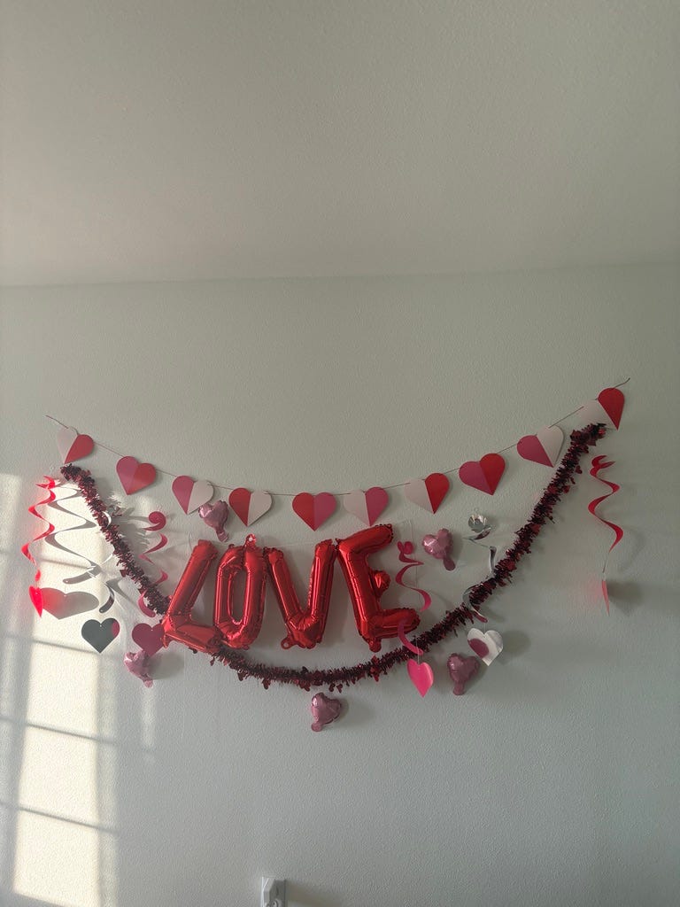 My cute Valentine’s decorations that my step mom lovingly sent me (I cried) were up for about 45 minutes before they all fell down, because I’m limited to Scotch tape right now. BUT LOOK HOW CUTE. It was definitely a serotonin boost while decorating!